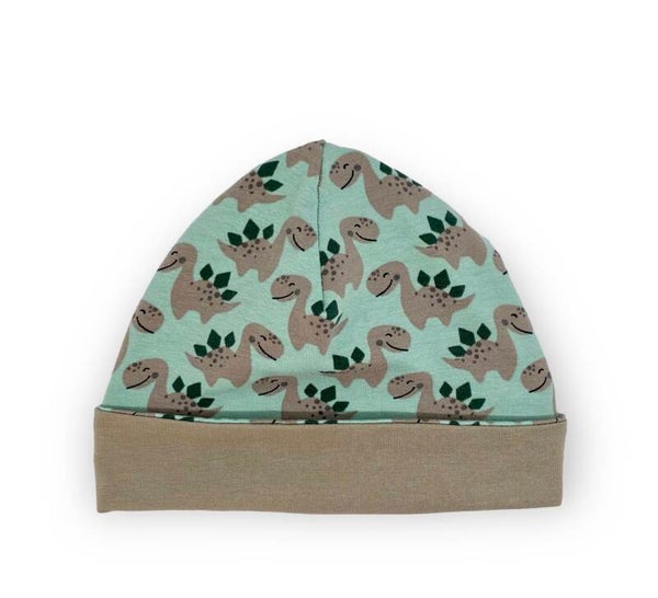 Dubbelzijdige beanie in zachtgroen met een dinoprintje en is 2-zijdig te dragen. Lekker warm voor de frisse dagen. Verkrijgbaar in 2 verschillende kleurstellingen.